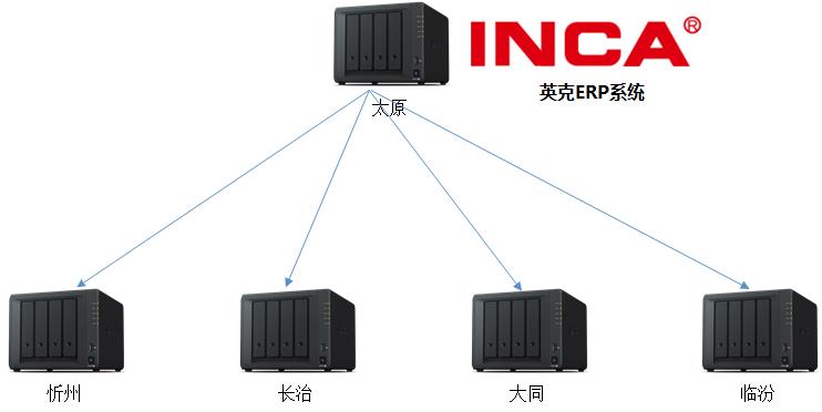 五個(gè)分公司各采購(gòu)一臺(tái)DS918+,以太原為中心,向其它分公司的DS918+進(jìn)行數(shù)據(jù)實(shí)進(jìn)下發(fā)(單向),同時(shí)太原中心的存儲(chǔ)與英克ERP進(jìn)行了集成(JAVA二次開(kāi)發(fā)),這樣,ERP的業(yè)務(wù)數(shù)據(jù)將自動(dòng)存儲(chǔ)到DS918+的文件夾,隨后下發(fā)到其它分公司。