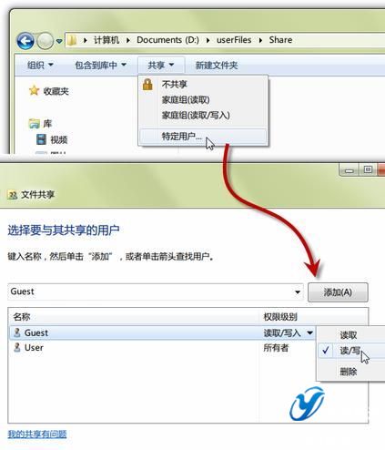 上述設(shè)置完畢,即可在Windows 7下開啟某個文件夾的共享功能,使得Mac電腦可以讀取甚至寫入文件的目的。打開需要共享的文件夾——在窗口上方的“共享”下拉菜單中點擊“特定用戶…”——在彈出的選項窗總添加“Guest”,并將權(quán)限級別進(jìn)行相應(yīng)設(shè)置。