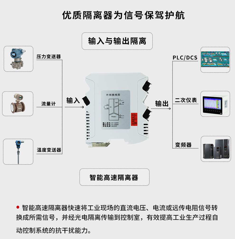 虹潤(rùn)公司是專(zhuān)業(yè)生產(chǎn)隔離器的國(guó)家專(zhuān)精特新“小巨人”企業(yè)。生產(chǎn)的智能高速隔離器 ,具有電壓電流遠(yuǎn)傳電阻輸入,10ms快速響應(yīng),輸入輸出電源三隔離,高抗干擾,低功耗發(fā)熱低等特點(diǎn)。產(chǎn)品獲得信號(hào)隔離器、一種二端子模塊、無(wú)源信號(hào)隔離器等3項(xiàng)國(guó)家發(fā)明專(zhuān)利,主持起草現(xiàn)場(chǎng)設(shè)備工具(FDT)接口規(guī)范、工業(yè)過(guò)程測(cè)量和控制系統(tǒng)用隔離式安全柵、工業(yè)過(guò)程測(cè)量和控制系統(tǒng)用配電器等3項(xiàng)國(guó)家標(biāo)準(zhǔn),以及通信系統(tǒng)多通道數(shù)據(jù)采集控制終端規(guī)范軍用標(biāo)準(zhǔn)。取得智能高速隔離器等3項(xiàng)相關(guān)軟件著作權(quán)。參與國(guó)際5G標(biāo)準(zhǔn)制定。產(chǎn)品廣泛應(yīng)用于電力、石化,冶金、制藥、水處理、機(jī)械配套等各種工業(yè)現(xiàn)場(chǎng)。