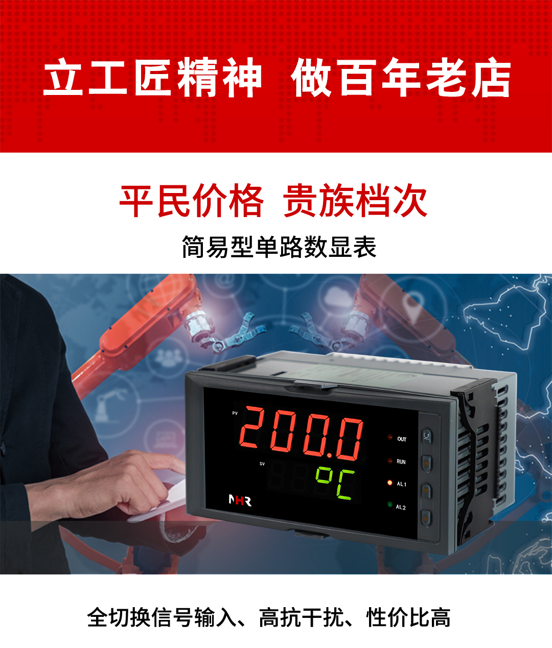 虹潤公司是專業(yè)生產(chǎn)數(shù)顯表的國家專精特新“小巨人”企業(yè),生產(chǎn)的簡易型數(shù)字顯示控制儀,具有全切換信號(hào)輸入,多種外形尺寸,高抗干擾,輸入/輸出/電源三隔離,性價(jià)比高等特點(diǎn)。該產(chǎn)品不僅通過德國萊茵 CE 認(rèn)證,還獲得巡回檢測(cè)顯示方法及裝置、儀表殼體等2項(xiàng)國家發(fā)明專利,主持起草工業(yè)過程控制系統(tǒng)用模擬輸入兩位或多位輸出儀表、物聯(lián)網(wǎng)智能溫度儀表通用技術(shù)條件等2項(xiàng)國家標(biāo)準(zhǔn),以及通信系統(tǒng)多通道數(shù)據(jù)采集控制終端規(guī)范軍用標(biāo)準(zhǔn),參與國際5G標(biāo)準(zhǔn)制定,取得簡易數(shù)顯儀表等3項(xiàng)相關(guān)軟件著作權(quán)。產(chǎn)品廣泛應(yīng)用于電力、石化、冶金、化工、造紙、食品、輕工、制藥、熱處理、水處理、機(jī)械配套等各種工業(yè)現(xiàn)場(chǎng)。