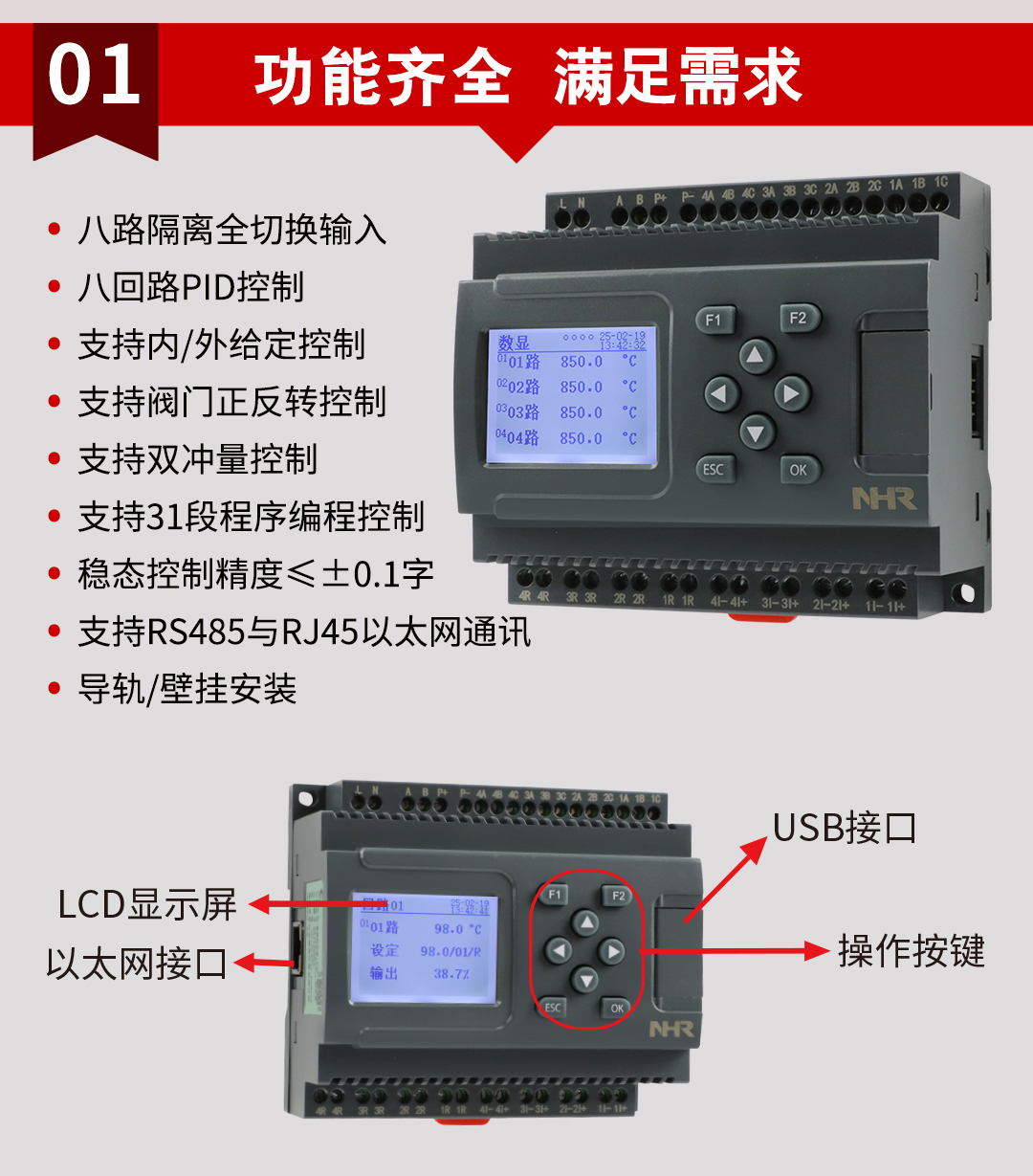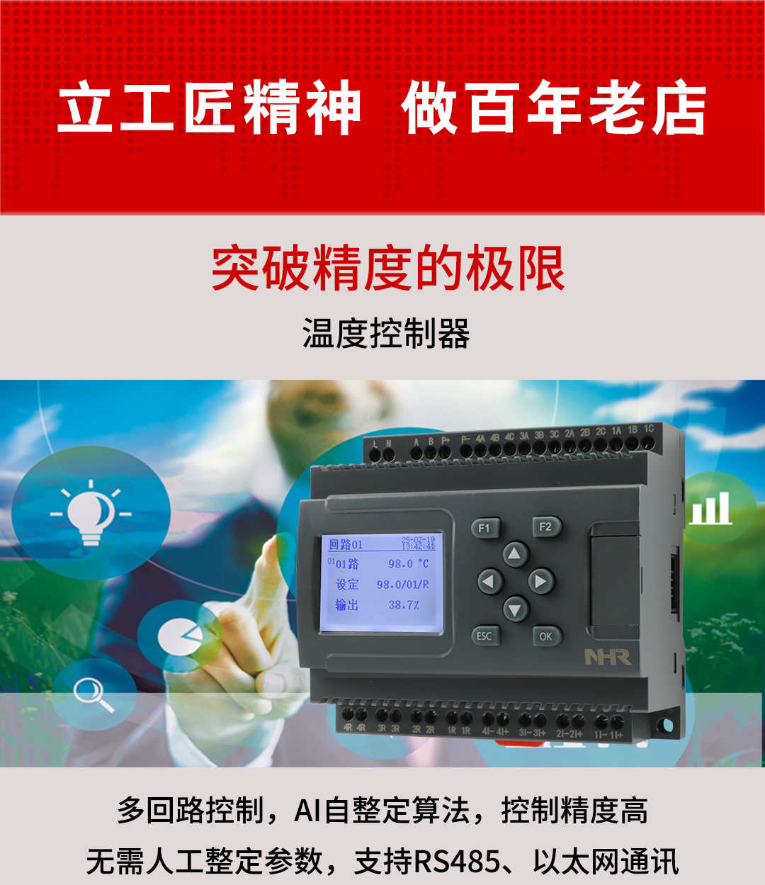 虹潤(rùn)公司是專業(yè)生產(chǎn)溫控器的國(guó)家專精特新“小巨人”企業(yè)。生產(chǎn)的溫度控制器,具有4路或8路PID控制,真正人工智能算式,無(wú)需人工整定參數(shù),控制精度達(dá)士0.1°C,數(shù)據(jù)記錄與轉(zhuǎn)存等特點(diǎn)。產(chǎn)品獲得智能化控制器、人工智能調(diào)節(jié)器及調(diào)節(jié)方法、模糊PID控制儀及控制方法、一種平板無(wú)紙記錄儀、巡回檢測(cè)顯示方法及裝置等5項(xiàng)國(guó)家發(fā)明專利,主持起草物聯(lián)網(wǎng)智能記錄儀表、物聯(lián)網(wǎng)智能溫度儀表、工業(yè)過(guò)程測(cè)量和控制系統(tǒng)用智能調(diào)節(jié)器等3項(xiàng)國(guó)家標(biāo)準(zhǔn),參與國(guó)際5G標(biāo)準(zhǔn)制定,取得液晶溫控器儀表等3項(xiàng)相關(guān)軟件著作權(quán)。產(chǎn)品廣泛應(yīng)用于電石化、工業(yè)爐、試驗(yàn)設(shè)備、注塑機(jī)械、包裝機(jī)械等需要對(duì)現(xiàn)場(chǎng)溫度進(jìn)行監(jiān)測(cè)控制的行業(yè)。