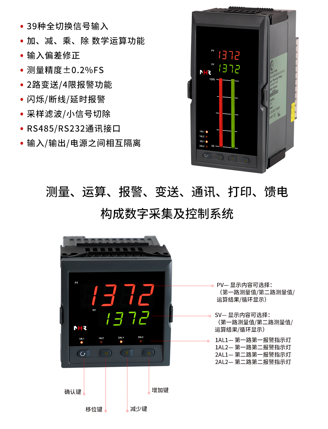 虹潤公司是專業(yè)生產(chǎn)數(shù)顯表的國家專精特新“小巨人”企業(yè),生產(chǎn)的智能雙路數(shù)顯儀表,具有全切換信號輸入,加減乘除數(shù)學(xué)運算,高抗干擾,過壓過流保護(hù),RS485/RS232通訊等特點。產(chǎn)品獲得巡回檢測顯示方法及裝置、儀表殼體等2項國家發(fā)明專利,主持起草工業(yè)過程控制系統(tǒng)用模擬輸入兩位或多位輸出儀表、物聯(lián)網(wǎng)智能溫度儀表通用技術(shù)條件等2項國家標(biāo)準(zhǔn),,以及通信系統(tǒng)多通道數(shù)據(jù)采集控制終端規(guī)范軍用標(biāo)準(zhǔn),參與國際5G標(biāo)準(zhǔn)制定,取得雙回路數(shù)字顯示控制儀表等3項相關(guān)軟件著作權(quán)。產(chǎn)品廣泛應(yīng)用于電力、石化、冶金、化工、造紙、食品、輕工、制藥、熱處理、水處理、機械配套等各種工業(yè)現(xiàn)場。