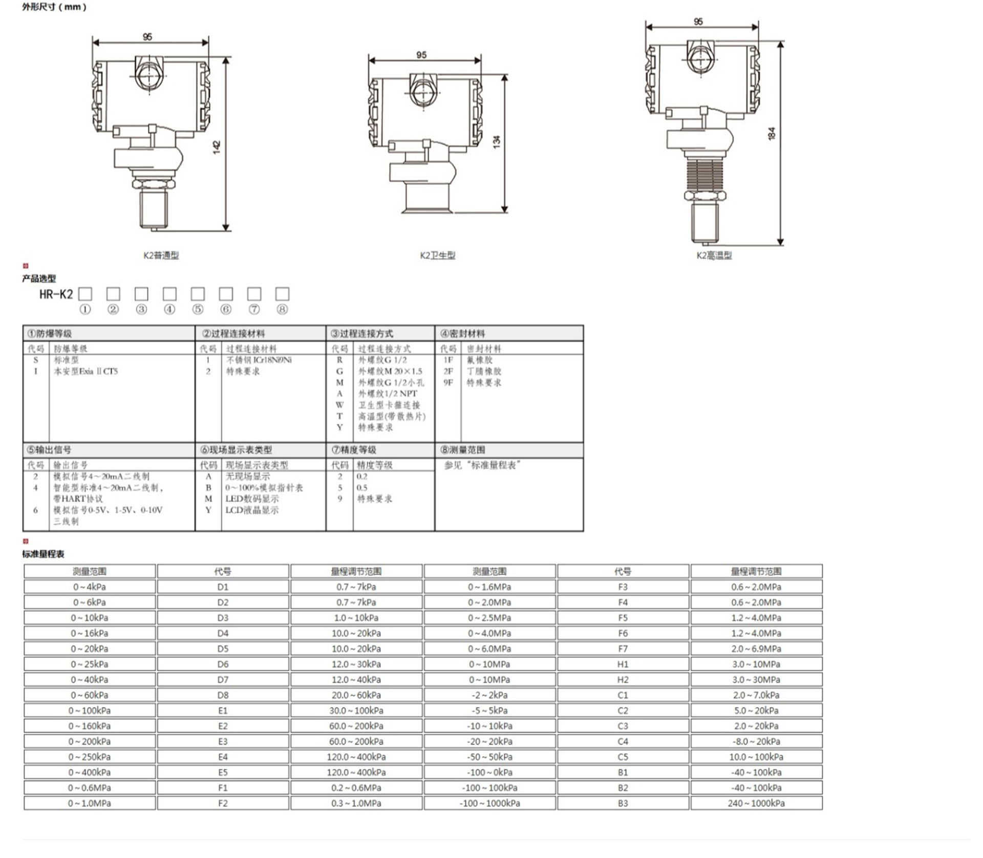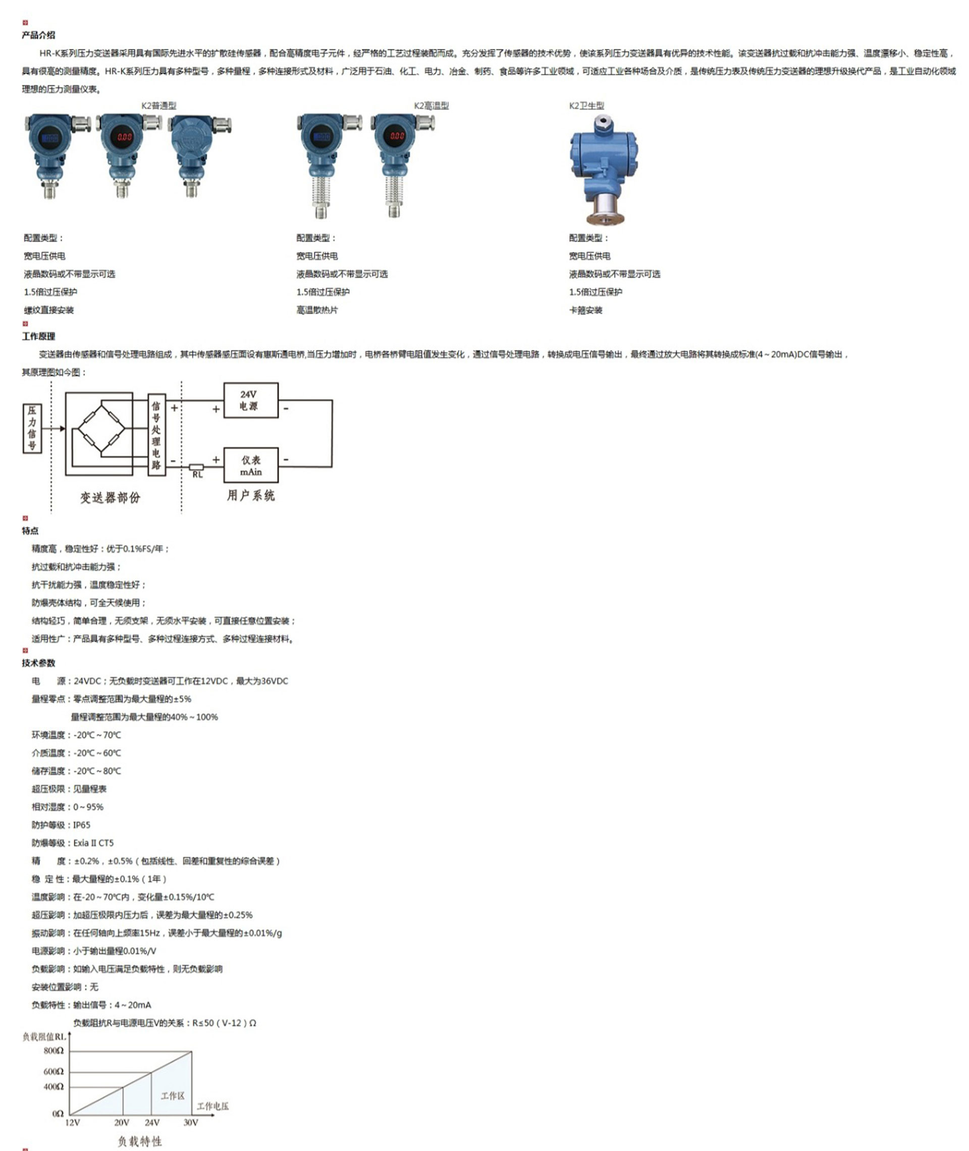 HR-K系列壓力變送器采用具有國際先進(jìn)水平的擴散硅傳感器,配合高精度電子元件,經(jīng)嚴(yán)格的工藝過程裝配而成。充分發(fā)揮了傳感器的技術(shù)優(yōu)勢,使該系列壓力變送器具有優(yōu)異的技術(shù)性能。該變送器抗過載和抗沖擊能力強、溫度漂移小、穩(wěn)定性高,具有很高的測量精度。